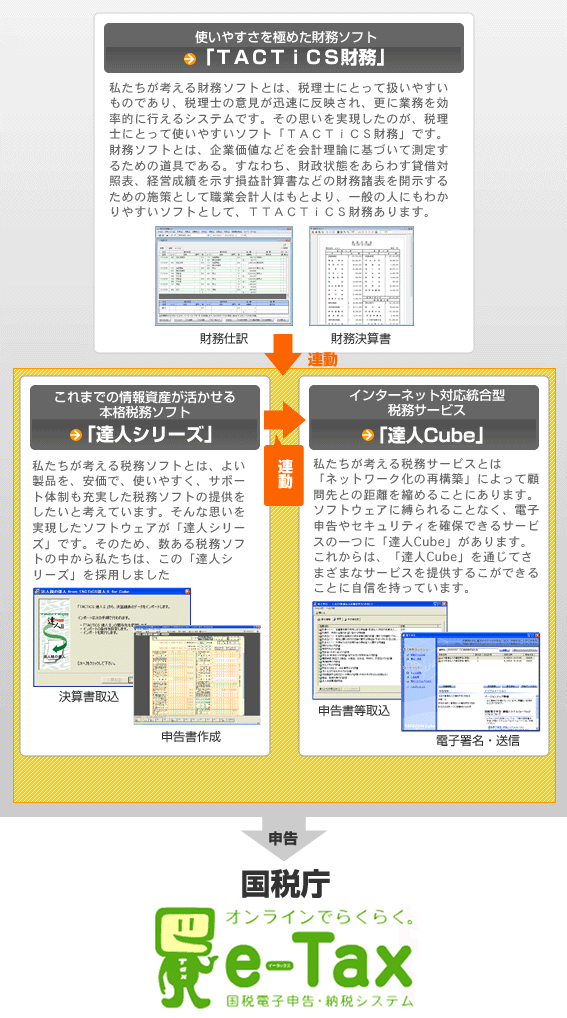 達人システムとは、永年の経験と確かな技術に裏づけされたシステムで、「税理士の知識と経験によるノウハウ及び株式会社NTTデータの卓越した技術」によって開発されたシステムをいいます。 TACTiCS財務は全国税理士データ通信協同組合連合会が提供する財務ソフトであり、達人シリーズは株式会社NTTデータが開発した税務ソフトをいいます。さらに、株式会社NTTデータが開発した税務サービス「達人Cube」もご提供しております。